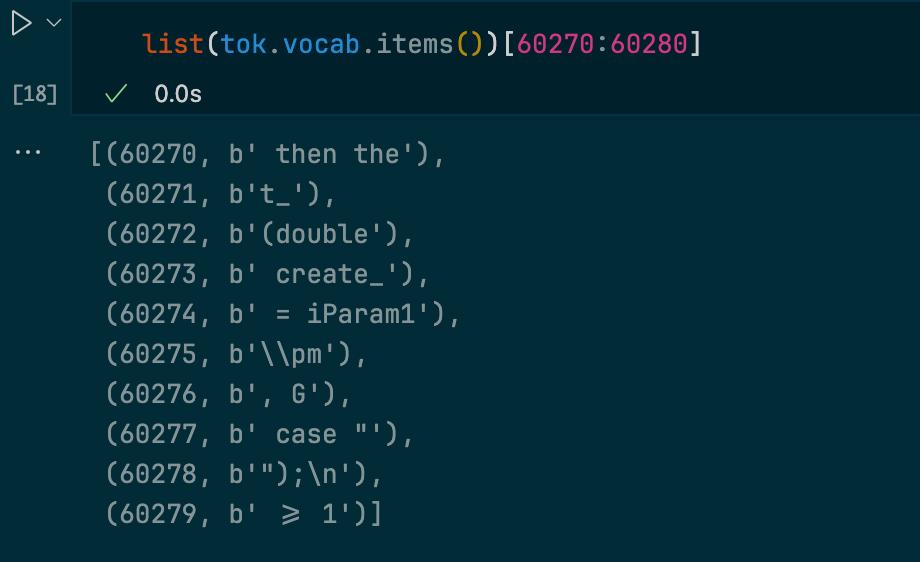 We could inspect vocab of SuperBPE to see that it’s indeed merged some whitespaces together into a single token or some phrases or code constructions. (screenshot is from the other experiment on slightly larger data and larger vocab)